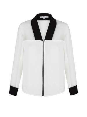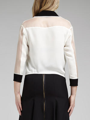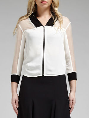 This scooped hem lightweight jacket from Rebecca Minkoff is a delicate spin on a sporty look, with sheer Organza panelling on the shoulders and sleeves, and black ribbed detailing on the neckline and cuffs. This is a piece that walks the line between masculinity and femininity.