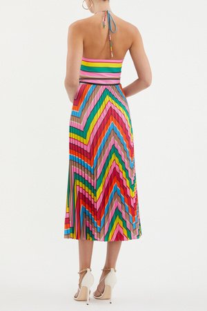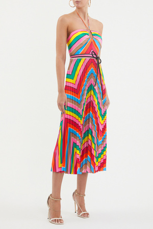 Product Details: - Style Number: 2301-1827 - Sunray pleat midi dress - Bold printed stripes - Halter neck ties - Gathered bodice with keyhole - Zip fastening at back - Partially lined - Tubular belt with gold cord ends - Due to the delicate nature of this fabric please avoid rough surfaces and jewellery which may result in damage. Wear with care. Size & Fit Information Item fits true to size, take your normal size - Model is 5'8/ 178cm tall and wears a 8 - Garment is in AU sizing Material Composition 80% Polyester/20% Cotton. Lining Composition Polyester. Drying Instructions Do Not Tumble Dry. Washing Instructions Dry Clean Only. Care Instructions Cool Iron on Reverse Only.