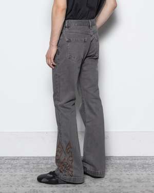 These grey jeans feature a slim silhouette with brown western embroidery on the sides of the pockets and hem. The pants flare out slightly at the hem, adding a distinctive character to any outfit. - Shell: 100% Cotton. - Made in China. - Machine wash cold, hang dry. Kobe is 6'0" (183cm) and is wearing a size M.