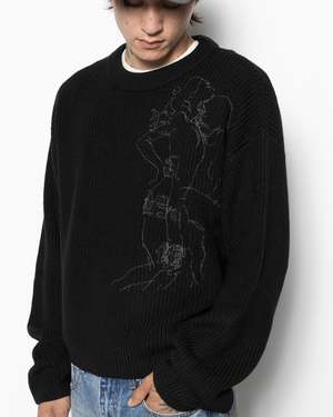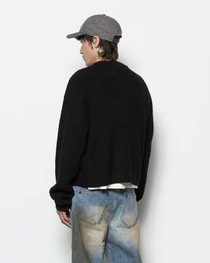 The Cropped Wool Sweater by Records INC. is a wool blend knitted pullover with a cropped length and elongated sleeves. Features a rib-knit collar and contrasting embroidery at the front. - 70% Wool, 30% Acrylic. - Made in China. - Dry clean. - RI042KNI-001. Taimen is 6'0" (183cm) and is wearing a size M.