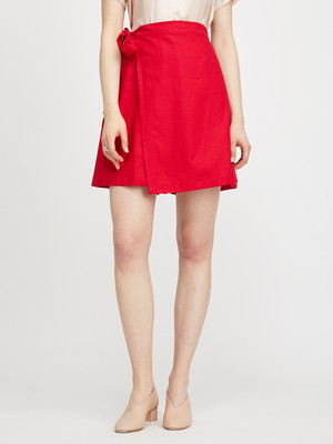 Bright cardinal red high waisted shorts with side tie wrap skirt front. Hem hits just above the knee. Single inseam side pocket. - Made in Portland, Oregon - 55% Linen, 45% Rayon - Wash cold & hang dry (Or dry clean) Fit true to size.