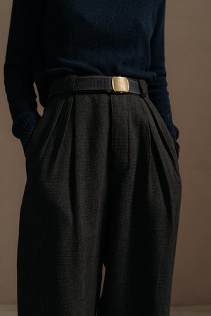 The first pair of pants in our small collectsion of in house designs. These oversized, menswear inspired trousers have a fitted waist, double front pleats, a single back patch pocket and a slightly cropped fit. Shown here in a textured cotton charcoal waffle, they are also available in a plain weave olive cotton. - 100% Cotton - Made in Los Angeles - Model is 5'6," a size 0 and is wearing a size XS Measurements: XS: Waist: 27, Inseam : 26 | S: Waist: 28, Inseam: 26 | M: Waist: 29, Inseam: 26.5 | L: Waist: 30, Inseam : 27 Designed to be simple wardrobe staples, our in house collectsion was inspired by some of Leah's favorite vintage finds over the years and are made in limited runs of dead-stock fabric, here in California.
