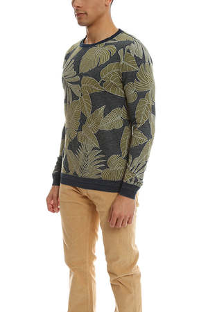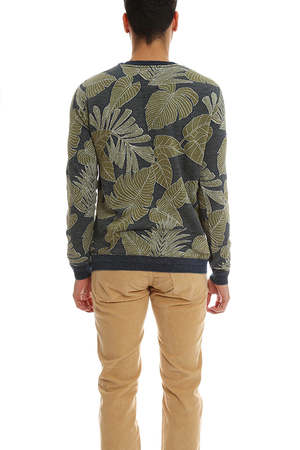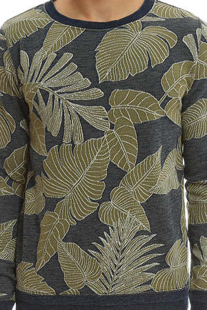 Focused on re-working California skate and surf style, Remi presents a cozy mid weight cotton jacquard crewneck equipped with a fashionable tropical print. Rib knit cuffs and waistband for added comfort and contrast. - Color: Blue - 100% Cotton - Made in Japan * Model is 6'1" wearing size Large Designer Remi Relief