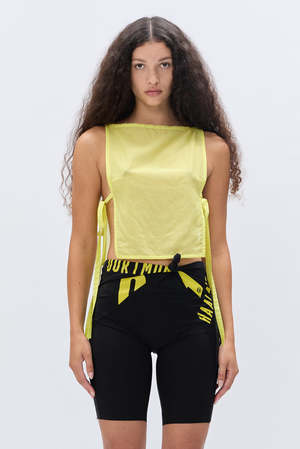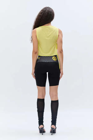 Cycling shorts in recycled lycra spliced with vintage football jerseys, knotted to contour the body. DETAILS High-waisted fit Knotted side detail Elasticated waistband Each piece is unique due to the upcycled source material FABRIC Upcycled football jerseys and recycled lycra. Main fabric: 100% Polyester. Secondary fabric: 86% Polyamide, 14% Polyurethane. FIT Close fit. Model is 170 cm / 5'7" and wears size S. ORIGIN Made in England. Produced in small quantities using reclaimed materials. CARE Gentle hand wash. PLEASE NOTE Due to the use of upcycled materials, colour placement and graphic details will vary. The piece you receive may differ from the one shown.