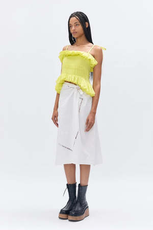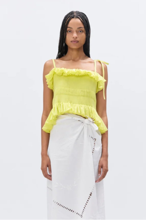 Hand-smocked top with straps, tied at the back in a corset style. Versatile and ideal for layering. DETAILS Corset-style back fastening Adjustable shoulder straps Hand-smocked construction Frilled edge detail FABRIC Ultra-lightweight silk blend with a natural sheen. 70% Cotton, 30% Silk. FIT Relaxed silhouette. Model is 170 cm / 5'7" and wears size S. ORIGIN Made in England. Produced in small quantities with responsible manufacturing methods. CARE Gentle hand wash.