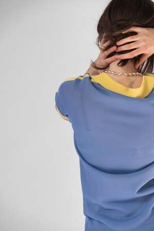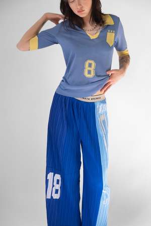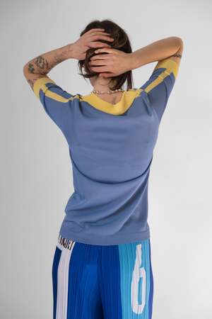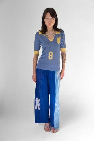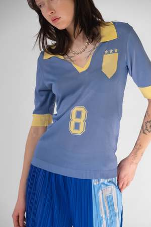 A two-toned viscose knit football-inspired jersey top in light blue and yellow. Renata Brenha's Spring/Summer 2025 collectsion, 'Grito de Carnaval,' explores the anticipation of preparation for Carnival in Brazil. Influenced by Maureen Bisilliat's photography of samba schools preparing for 60's and 70's Carnival, the collectsion merges football clichs with the spirit of Carnival. 100% Viscose Made in England Lily is 5' 11" and wears a medium. *Artisan techniques were used for the production of this garment, leaving each piece with unique variances.