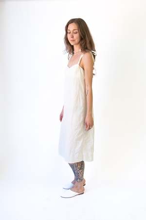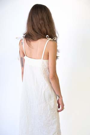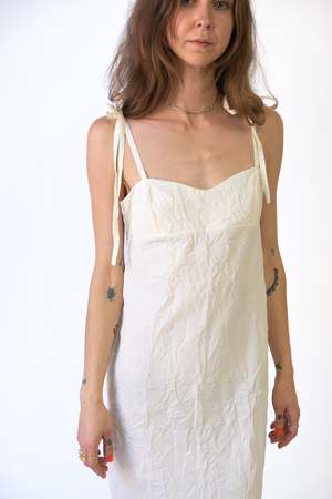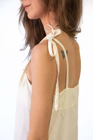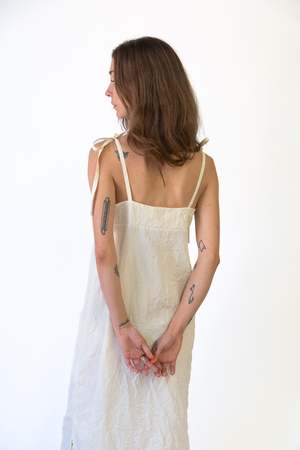 A beautiful slip dress in cream made from 100% recycled polyester with a tie closure detail. Artisanal techniques were used in the production of this garment, making each piece unique with slight variances.