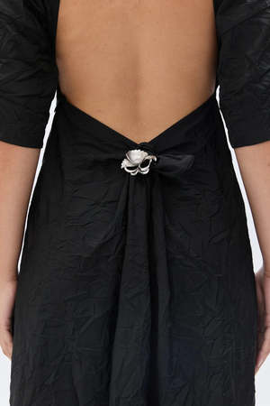 T-shaped dress in ultra-soft crushed pleated fabric, cut with an effortless silhouette and featuring an open back with knot detail, accented with a vintage silver brooch. DETAILS Open back with knot fastening Vintage silver brooch detail T-shaped silhouette Heat-set crushed pleats FABRIC Lightweight soft fabric with heat-set crushed pleats. 100% Recycled Polyester. FIT Relaxed silhouette. Model is 170 cm / 5'7" and wears size S. ORIGIN Made in England. Produced in small quantities with responsible manufacturing methods. CARE Cold wash.