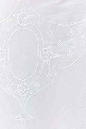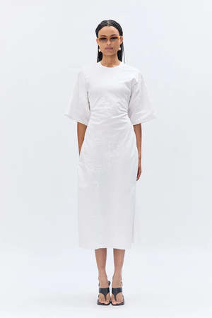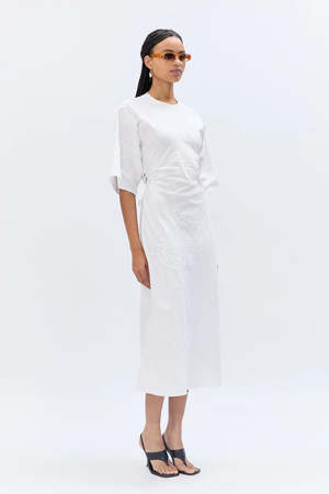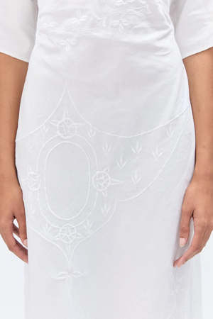 Crafted from vintage tablecloths, this dress is cut with an effortless silhouette and features an open back with knot detail, accented with a vintage silver brooch reminiscent of napkin rings. DETAILS Open back with knot fastening Vintage silver brooch detail T-shaped silhouette Each piece is unique due to the upcycled source material FABRIC Multi, mostly cotton and linen. FIT Relaxed silhouette. Model is 170 cm / 5'7" and wears size S. ORIGIN Made in England. Produced in small quantities with responsible manufacturing methods. CARE Gentle hand wash. PLEASE NOTE Due to the use of upcycled materials, embroidery placement and textile variations will differ. The piece you receive may vary from the one shown.