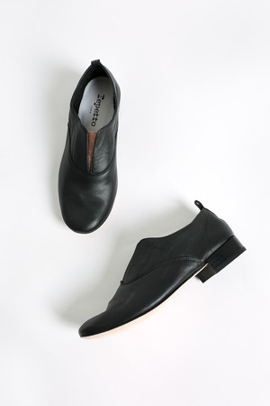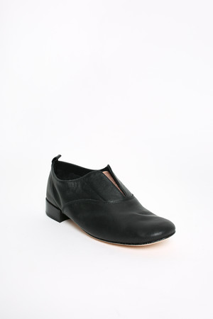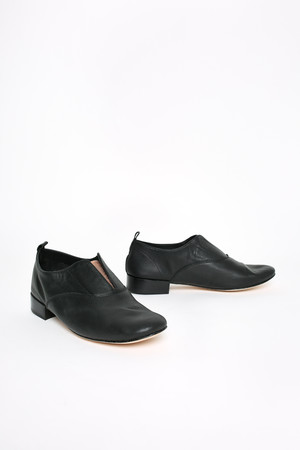 Blackslip-on oxford shoe with gold metallic elastic tongue. Features rounded toe, pull tab at heel, canvas lining, and leather insole and heel. Color:Noir Materials: Nappa calfskin upper, sheepskin insole, leather heel, canvas lining Height:Approximately .4" heel Fit:Runs small; sizing up recommended Origin: Made in France