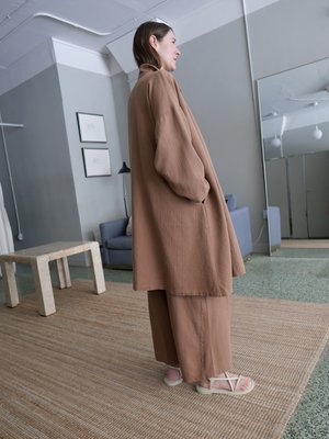 A lightweight shirt jacket in organic cotton floral jacquard. Featuring a relaxed fit with a convertible neckline, dropped shoulders, and side pockets. Finished with a center front placket closure with natural corozo buttons. The fabric is woven exclusively for Revisited Matters in a small atelier in Portugal. Made in Barcelona. One size. 100% organic cotton Clara is 510 with a bust measurement of 34 inches, a 27 inch waist and 38 inch hip.