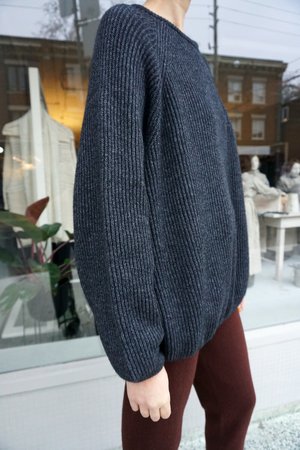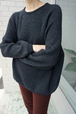 REVISITED MATTERS CREWNECK SWEATER. A COZY RAGLAN SLEEVE SWEATER IN AN ALPACA & FINE MERINO WOOL COMBINATION. THE SWEATER COMES IN THREE COLOURS: DARK CHARCOAL, OAK (OATMEAL) AND CAMEL FEATURES AN EASY ONE SIZE FIT, SOFT RIBBED KNIT, RAGLAN SLEEVE, 1 / 2 INCH CREWNECK BAND, AND 1 INCH RIBBED DETAILING AT CUFF AND HEM. CENTER BACK MEASURES 27 INCHES FOR LENGTH. DESIGNED AND HANDMADE IN SPAIN. (65% alpaca, 35% fine merino wool) -Patricia Grace is wearing the one size. She is 5'7 with a 32" bust, 27" waist and 34" hip.