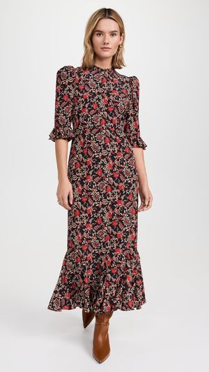 Fabric type 100% Viscose Care instructions Dry Clean Only Origin Imported About this item - Runs true to size, Designed with a slim, midi-length silhouette. Non-stretch viscose fabric has a smooth and cool feel. - Fabric: Lightweight, non-stretch satin - Lightly padded puff shoulders, Ruffle trim, Floral print - Lined - Elbow-length sleeves