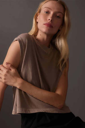 Richer Poorer relaxed cropped fit muscle tee in warm grey taupe. Dropped muscle sleeve with small rib finish. Size small measures 19.25" total body length. Model is wearing a size M. 100% cotton. 34WTT-SSRM WMGR PIPE AND ROW