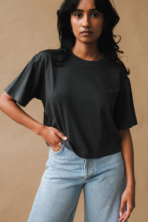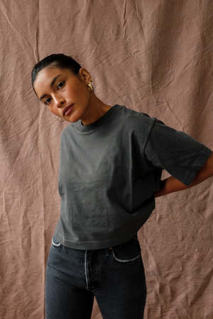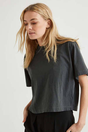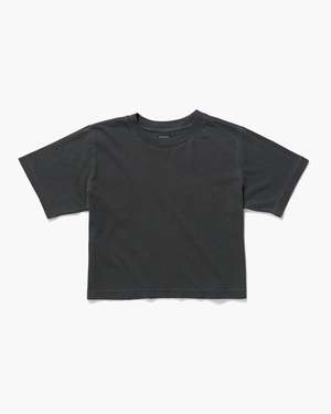 Richer Poorer relaxed short sleeve crop tee in amazing semi-thick cotton. Pigment dyed, dropped shoulder seams. Oversized neck rib. Brunette model 5'4" wearing a size S. Blonde model is 5'9", wearing size S. 100% Cotton. Wash separately before wearing. Wash cold, hang to dry. Do not bleach.