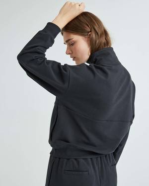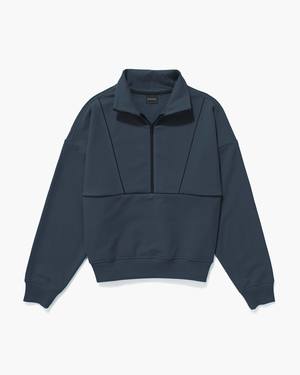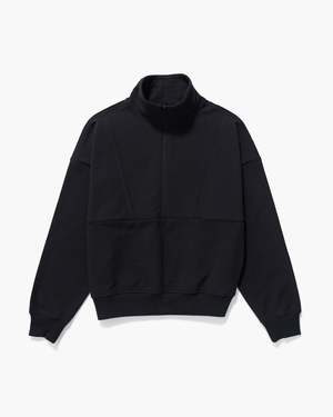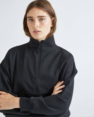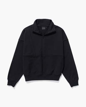 - Unique stretch, mini loopback French Terry - Fabric is super drapey, lightweight, and moisture-wicking - Relaxed pullover fit that is rounded through the body with ribbed hem for modern shape. - Dropped shoulder seams - Tall Mockneck with half zip for versatility - Piping detail at chest seams - Discrete side seam kangaroo pocket for sleek comfort