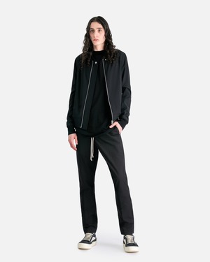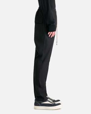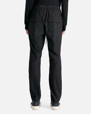Rick Owens SS24 Lido slim pants in black. These pants feature an elasticized waistband with the signature Rick Owens elongated drawstrings. There are two side pockets on the front and two back flap pockets. Product sku RU01D3390-P-09 Model measurements {"type":"root","children":[{"type":"paragraph","children":[{"type":"text","value":"Regular fit"}]},{"type":"paragraph","children":[{"type":"text","value":"Model is 6'4\" with a 30\" waist and wears size 48"}]}]} Products features Elasticized waistband Elongated drawstring Two side pocket Two back flap pockets Slim silhouette Creases at front and back legs Product composition 96% wool, 4% elastane Made in Italy