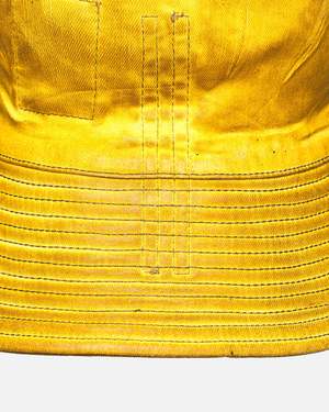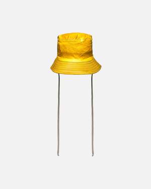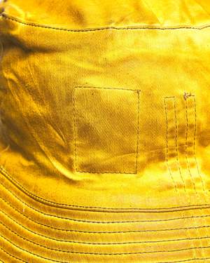Rick Owens DRKSHDW Gilligan Hat in Ochre. This bucket hat features an over-dyed foil-coated denim construction, self-tie drawstring, quilted stitching at brim and a smudged finish throughout.