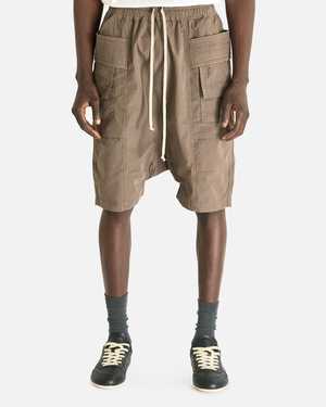 These Creatch Cargo Pods shorts from Rick Owens are crafted from a lightweight cotton poplin ripstop fabric and feature an elasticated waist with drawstrings, dropped inseam, 4-pocket styling, layered front pockets, and side belt straps at the front. Relaxed fit, straight leg, below knee length. Model is 6'3" with a 30" waist and wears size medium. Product SKU: DU01F4382-CR-34 Product Features - Elasticated waist with drawstrings - Dropped inseam - 4-pocket styling - Layered front pockets - Side belt straps at front Composition - 100% cotton - Made in Italy