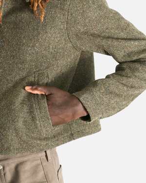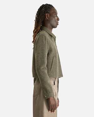 The Brad Jacket by Rick Owens is crafted from a heavyweight wool melton and features a classic collar, a zip front closure, signature level shoulder seams, side welt pockets, and a cotton webbings strap at the shoulders. Product SKU: RU02E1764-WBD-25. Fit and sizing: - Regular fit, slightly cropped - Model is 6'4" and wears size 48 Features: - Classic collar - Zip front closure - Side welt pockets - Interior zip pockets - Cotton webbings strap at back - Snap button cuffs - Metal rivet detail - Sleeve lining Composition: - Main: 100% wool - Lining: 100% cupro Made in Italy.