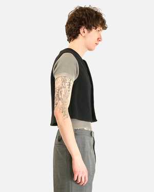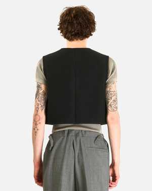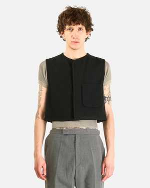 This collarless vest is crafted from lightweight woven wool and felted like a loden. It is completely unlined and features a concealed button front closure, a patch pocket on the front, an interior patch pocket, and ribbed trim. This wool fleece does not normally need to be washed; its inherent dirt- and odor-resistant properties effectively make this unnecessary. Product SKU JKT37-WLT-BLFL Model Measurements - Regular fit, cropped - Model is 6'1" and wears size medium Product Features - Collarless - Concealed button front closure - Patch pocket on front - Interior patch pocket - Ribbed trim - Unlined Product Composition - 100% wool - Made in Austria