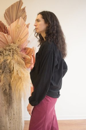 The Tucked Trouser by Rightful Owner is made from a soft tencel-cotton blend. The fabric is sustainable and has a beautiful drape while maintaining structure. Features include front pockets and an elastic waistband for comfort and ease. This trouser has a relaxed fit in the leg, with front pleats and a tucked pleat at the hemline for a slightly tapered style. 46% Tencel, 54% Cotton Fabric does not have much stretch to it, but there is elastic in the waistband. Dry clean only. Made in Montreal.