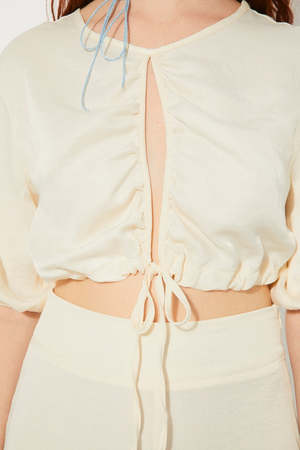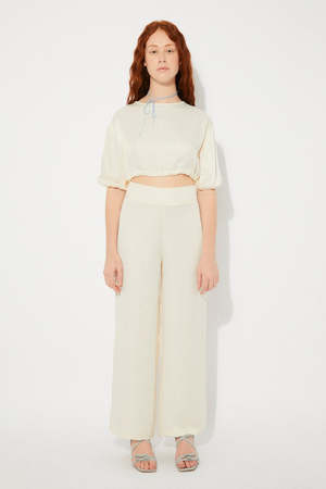 Crop top in fluid fabric with a teardrop-shaped opening. It can be worn with the opening in the front or back and can be tied with a bow for a better fit. Biposition. Composition: 33% Linen, 17% Ecovero, 50% Recycled Polyester. Made in Portugal.