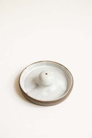 A circular incense holder in a dark stoneware with white glaze. Features a small tray for catching ash. Measures approximately 3.5" wide. Please note that each piece is made by hand with careful attention to detail and may vary slightly from the image portrayed. Measurements may differ slightly due to the handmade process.