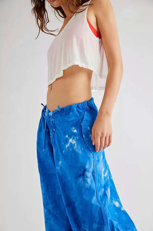 Hand-dyed in small batches, these one-of-a-kind pants are sure to stun with every wear. Effortlessly cool with a retro-inspired touch, pair these pants with your favorite cropped tank for the perfect throwback look. Fit: Exaggerated balloon silhouette with slouchy, low-rise fit Features: Bungee detailing at the waistband, hand-dyed washed fabrication, side pockets, banded hemlines Effortlessly cool with a retro-inspired touch, pair these pants with your favorite cropped tank for the perfect throwback look. XS/S waist 27"-31" inseam 29"-32" Care Machine washing cold water and tumble dry low heat Content 100% cotton