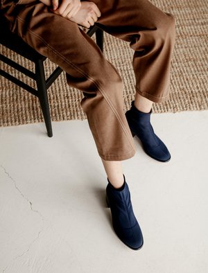 A sleek and modern take on a 90s classic. The Macet Stretch Boot is a fitted navy ankle boot with contrasting black block heel. A great shape for straight leg pants. - Made in France - Height 2.75 - Leather insole and lining - French sizing, take a 1/2 size up from your usual size