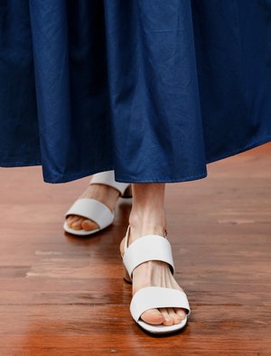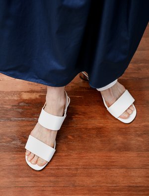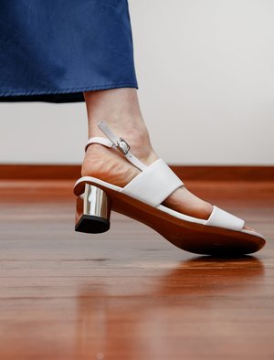 White lambskin sandals from Clergerie featuring a 40mm geometrical heel with a snazzy metallic silver finish. Detailed with an elasticated adjustable ankle strap, and two soft leather bands that are soft and oh so comfortable for all day wear. - Made in France - 100% lambs leather - French sizing, we recommend taking a size up from your usual size; ie if you usually take a 38, take a 38.5