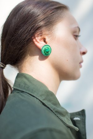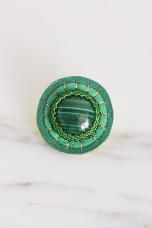 Green Malachite earring set in leather. Handmade in New York. Sold as a pair. Working with vividly hued leathers, antique beads and stones, Robin Mollicone's jewelry merges indigenous craft techniques with a contemporary sensibility.