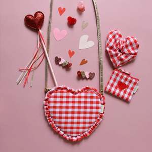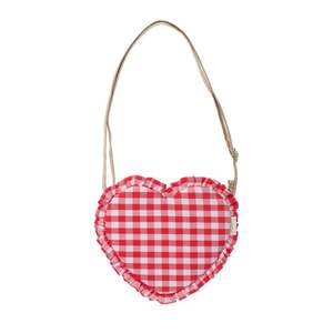 This love heart bag is adorable and will make little hearts skip a beat! Made in a gorgeous red gingham fabric, with a sweet ruffle finish. This bag is fully lined in a striped fabric and features a mag-dot opening and adjustable gold strap with breakpoint for safety. Totally love-able! Bag dimensions: 19cm x 17cm x 1cm. Strap drop length: 46cm.