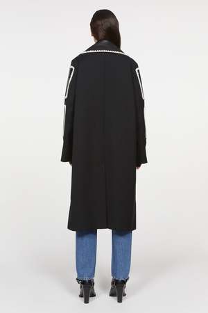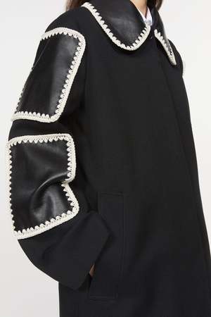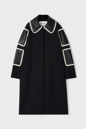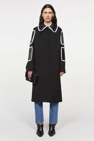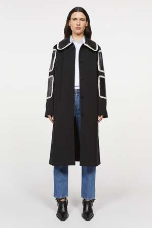 By Rodebjer Aida is a contemporary reimagining of the classic car coat. The hand-crocheted patches, crafted in supple recycled leather, add characterful, elevating touches. Fully lined, it fastens with one visible button at the neckline and four concealed buttons. The coat has welt pockets and a vent at the center back for ease of movement. - Below knee length - Regular-length sleeves - Color: Black - Measurements in size S: Chest 110cm, bottom 129cm, front length 115cm