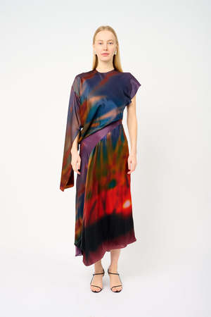 The Alia dress's graceful, asymmetrical design skillfully blends movement. Roksanda's hometown of Belgrade and the scenery found along the banks of the Danube and Sava rivers served as inspiration for the print of this mid-length silk-satin dress. Material - Sunset Bamboo/Hickory silk-satin Details - Roksanda silk-satin dress - Printed, round neck, dropped shoulders - Split at long sleeve - Asymmetric draped effect at waist and hem - Fully lined - Concealed zip at shoulder - Concealed hook-and-zip fastening - Specialist dry clean Fit - Relaxed fit - Fits true to size Sizes - 6UK, 8UK, 12UK