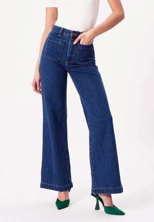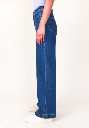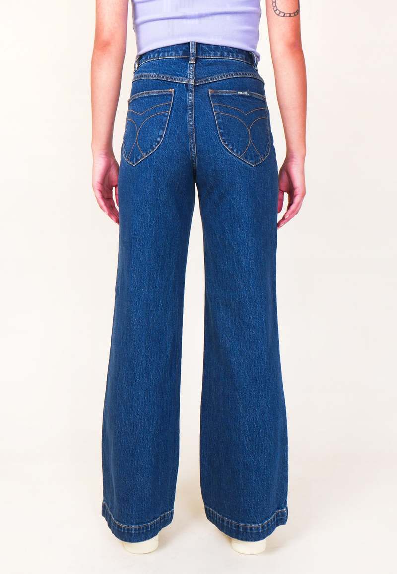 Rollas Sailor Jeans Long - Eco Ruby Blue Classic jean you can't go wrong. Sizing: Regular - shop to size Materials: 99% cotton, 1% elastane - Front and back pockets - Belt loops, all the possibilities - High rise waistline - Button zip fastening - Patchwork style pockets - Comfortable!