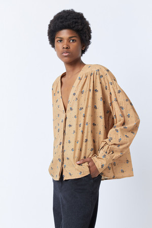 Roseanna blouse made of flamed cotton, exclusive print designed by Roseanna, caramel color Loose fit Long slightly puffed sleeves V-shaped neckline Gathers on the shoulders Hidden buttoning system closed by snaps