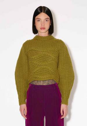 Put a twist on your wardrobe with this Best Tresse Sweater in olive! Crafted with virgin wool cable knit, this Roseanna jumper is sure to turn heads with its round neck, twisted knit, and slightly puffy long sleeves. But the real showstopper? The bottom, which is short and wavy for a look that'll get you noticed. Go bold or go home! - Twisted knit - Short and wavy at the bottom - Long, slightly puffed sleeves - Made in Italy
