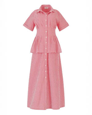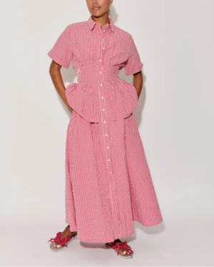 The Boogie Woogie Bugle Boy Dress in seersucker red gingham by Rosie Assoulin brings a playful yet structured silhouette with its cinched waist and voluminous skirt. - 100% cotton seersucker - Made in India - Dry clean