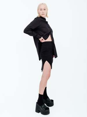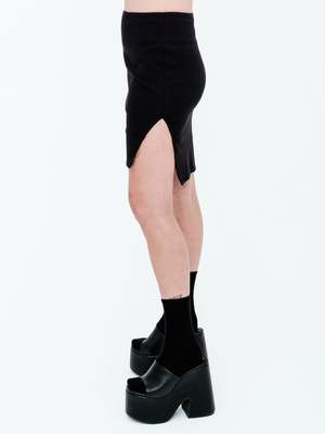 This slim fitting mini skirt is cut in a heavy rib knit for ultimate comfort and style. It features a signature high low hemline with side slits on both sides and a hidden elastic waistband for added function. Model is 5'7" (170cm) wearing size Small. Made in New York City. MADE TO ORDER ITEM, WILL SHIP IN 2-4 WEEKS