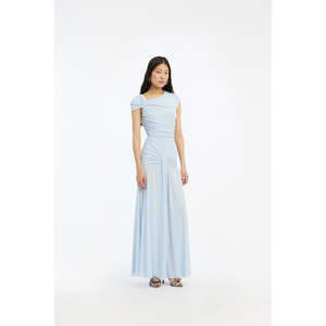 Maxi Asymmetric Dress Light Blue is a one-shoulder maxi dress with an asymmetric neckline and a softly draped silhouette. The design features gathered detailing through the bodice and waist, creating a ruched effect that continues into a fluid, floor-length skirt. A central draped knot detail at the front adds dimension to the silhouette. Composition 1: 97% Polyester (Recycled), 3% Elastane Lining: 95% Polyester (Recycled), 5% Elastane The model is wearing a size 34. The model is 175 cm tall. Color: Light Blue Production Country: China Type: Dresses