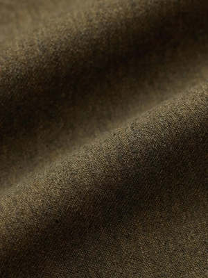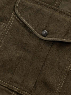 These olive Regiment Fit Cargo Pants by RRL are made from a wool-cotton Japanese twill with waxed canvas reinforcements. They feature a regular fit, straight leg, button fly, and drawstring hems. Pockets include angled front, coin, cargo, and snapped back pockets, all with waxed canvas details for durability. Shell: 45% wool, 37% cotton, 14% polyester, 4% other fibers. Panels: 100% cotton.