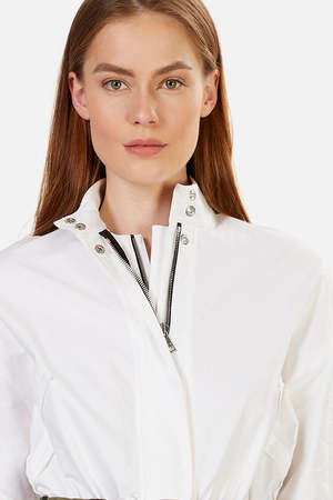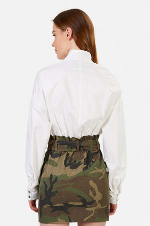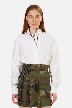 - Color: White - Heavyweight shirting fabric - Non-stretch camo denim skirt - Stand collar with snaps - Front zip closure with hidden placket - Self-tie waist belt - Welt pockets - 100 % Cotton - Contrast 65% Polyester 35% Cotton - Imported - Style #: WS0467-6055WHT - Dry clean only * Model is 5'9 wearing size XS Productcode RTASP20-05 Designer RtA