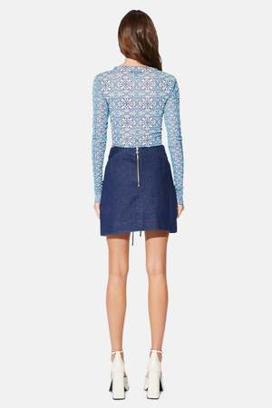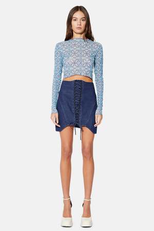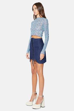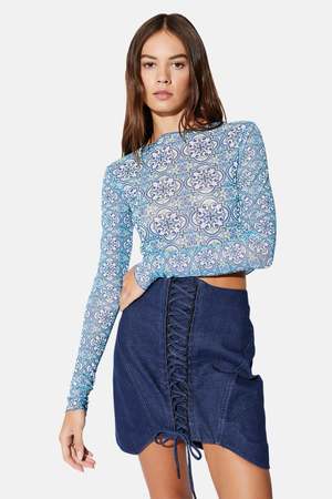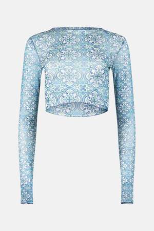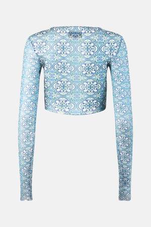 - Lime Azule - 94% Polyester, 6% Spandex - Fitted - Inspired by the classic blue and white azulejo tiles of Portugal - The Tomas mesh cropped top features a geometric design, and long sleeves and is finished with an overlock stitch hem - Machine wash cold - Do not Bleach - Dry Clean Safe - Imported