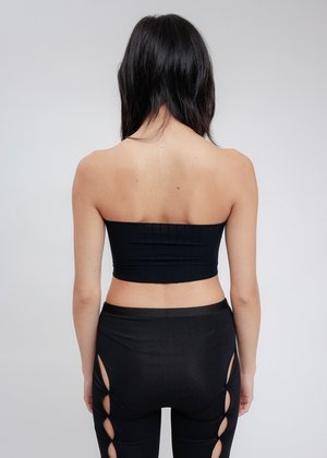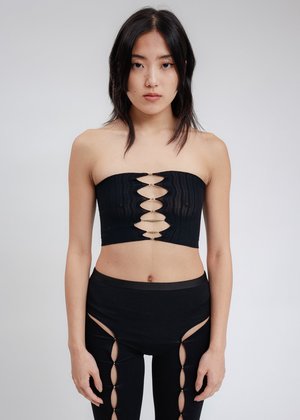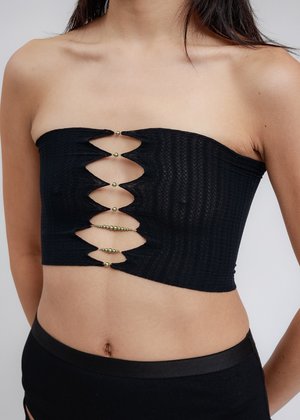 Black semi-sheer tube top. Features cut-out detailing throughout with iridescent green crystal pearl bead trim. Slim fit. Slim Fit Material: Fabric: 92% Nylon, 8% Spandex Trim: Iridescent Green crystal pearls Model is wearing a size 1 Model is 5'7" (170 cm), 95 pounds (43 kg), usually wears S in tops. A size 25 in denim and XS in trousers. Size 7 in shoes. *FINAL SALE*