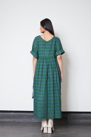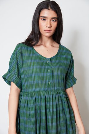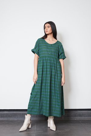 a versatile one size dress drawstring at waist to wear cinched or loose fitting button front bodice hem hits at ankle