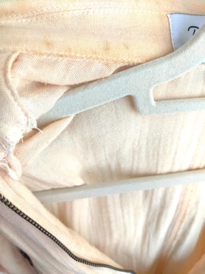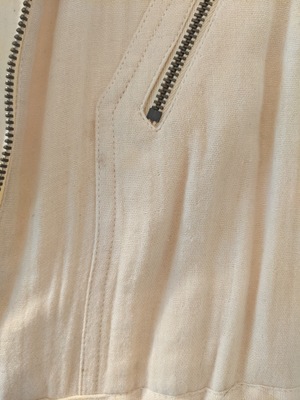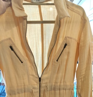 Rujuta Sheth description: "Utilitarian inspired jumpsuit with zipper front Drawstring waist Exposed zipper details on the chest and legs Tapered leg that hits at ankle Each piece will have a different print placement from the style in the photos 100% Hand-loomed Cotton Designed In New York | Handcrafted In India" This colorway is no longer sold on the Rujuta Sheth website; the piece retailed at $248 when it was available. It's a very light yellow and, as I tried to show in one photo, pretty sheer fabric on the top: I would wear a cami underneath if that will be a concern. I included photos where there are small / slight discolorations; I also included the RS size guide for the jumpsuit. As a 5'3'' woman, I found the inseam still too long for me. Only worn a few times! From a non-smoking apartment with a cat.