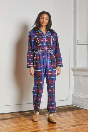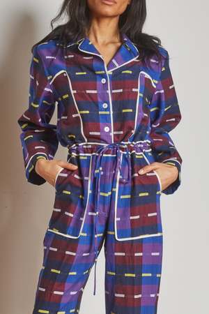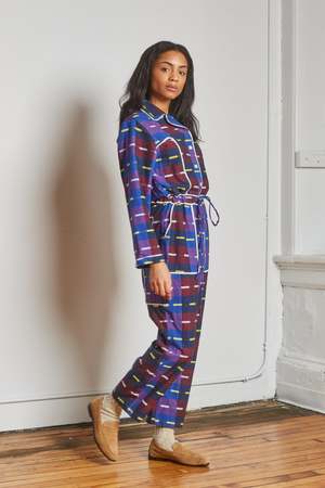 Relaxed long-sleeve jumpsuit in a bold woven check with multicolor stripe accents. Button-front closure with notched collar and contrast piping for a tailored finish. Adjustable self-tie belt at the waist for a customizable, flattering fit. Straight-leg silhouette designed for comfort and ease of movement. Functional side pockets for everyday practicality. Versatile one-piece that can be styled casually with flats or dressed up with heels. Model is 5'9" and wears size S. 100% Handloom Cotton. Designed in New York. Handcrafted in India.