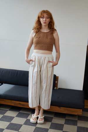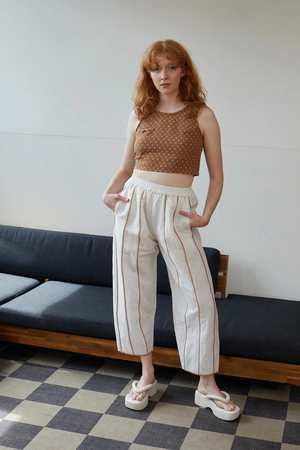 The Etta is a fun pant style for the warmer days ahead. Featuring a cropped leg with a rounded silhouette, a comfortable elastic waist, side seam pockets, and a contrast piping detail down the legs and across the hem. Made from a breathable cotton/linen blend, these pants are sure to keep you comfortable and cool. Materials: 55% Linen 45% Cotton Fit: True to size for a relaxed fit through the leg. Garment Measurements: XS | Waist 26"-40" | Hip 42" | Front Rise 13.5" | Back Rise 15" S | Waist 28"-47" | Hip 44" | Front Rise 14" | Back Rise 15.5" M | Waist 30"-44" | Hip 46" | Front Rise 14.5" | Back Rise 16" L | Waist 32"-46" | Hip 48" | Front Rise 15" | Back Rise 16.5" XL | Waist 34"-48" | Hip 50" | Front Rise 15.5" | Back Rise 17" 1XL | Waist 36"-50" | Hip 52" | Front Rise 16" | Back Rise 18.5" 2XL | Waist 39"-53" | Hip 55" | Front Rise 16.5" | Back Rise 19" 3XL | Waist 42"-56" | Hip 58" | Front Rise 17" | Back Rise 19.5" Story: Designed in NY, ethically handcrafted in India.