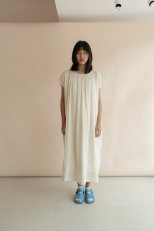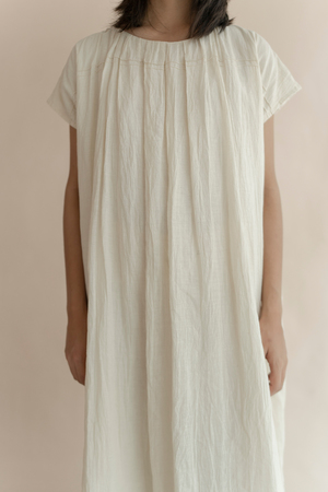 A gather at the neck with pleats spreading out in unrestrained glee. Handwoven cotton brings the softness and form. A Handwoven Dress | 100% Handloom Cotton - Comfort Fit - Gathered Neck - Inseam Pockets - Made in India - Model is 5'7 and wearing a small/medium size Garment Measurement Small/Medium: Length: 47.5", Chest: 53", Shoulder: 25.5" Large: Length: 48", Chest: 55", Shoulder: 26.5" Please note these are the approximate measurements in inches. All the products are handcrafted and the measurements may vary a little due to its handcrafted nature.